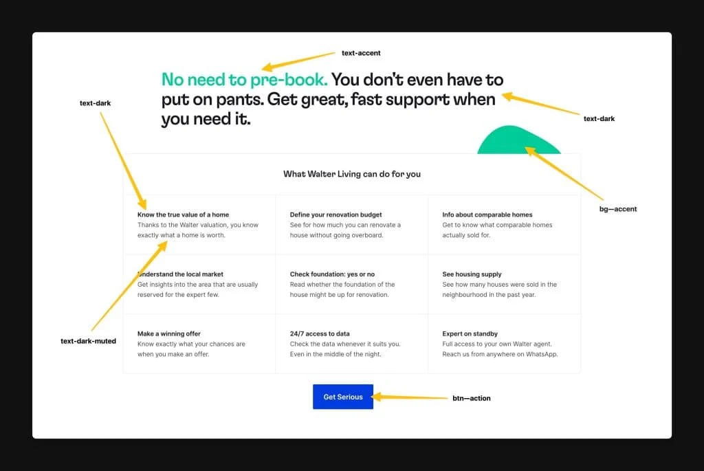 As you can see, we’re referencing the context of light backgrounds, dark text, muted text, etc. without the need for referencing specific colors. This is because the colors are pre-assigned to these contexts.