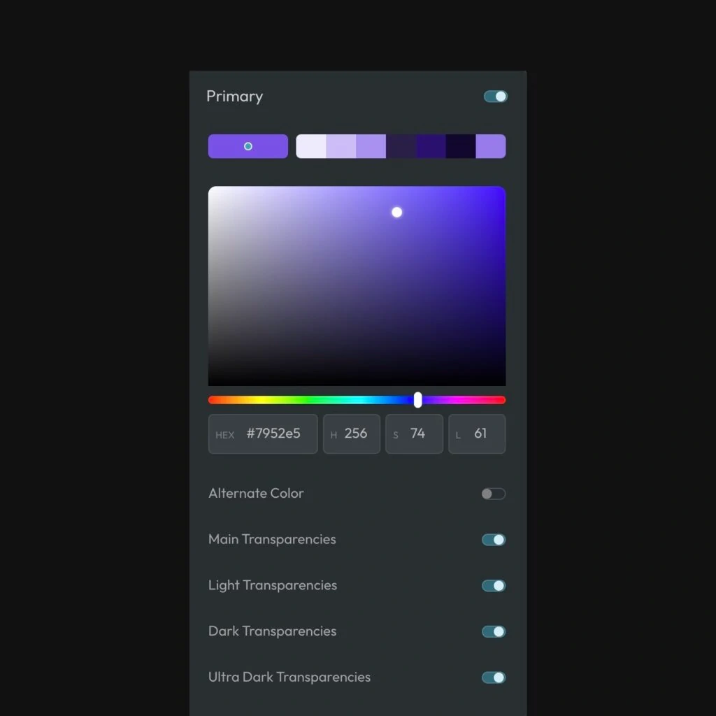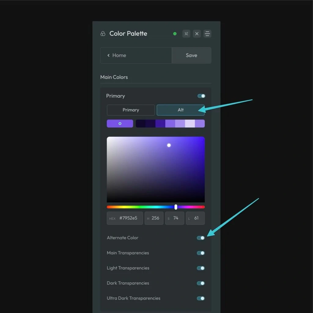 When you activate “Alternate Color” for any given color, a new “Alt” tab will appear above the swatches area. Clicking the tab will reveal all the settings for the Alt color and its shades. Configure this alternate color however you’d like.